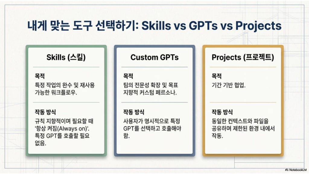 Skills=일하는 방식 / GPTs=캐릭터 / Projects=협업 공간
