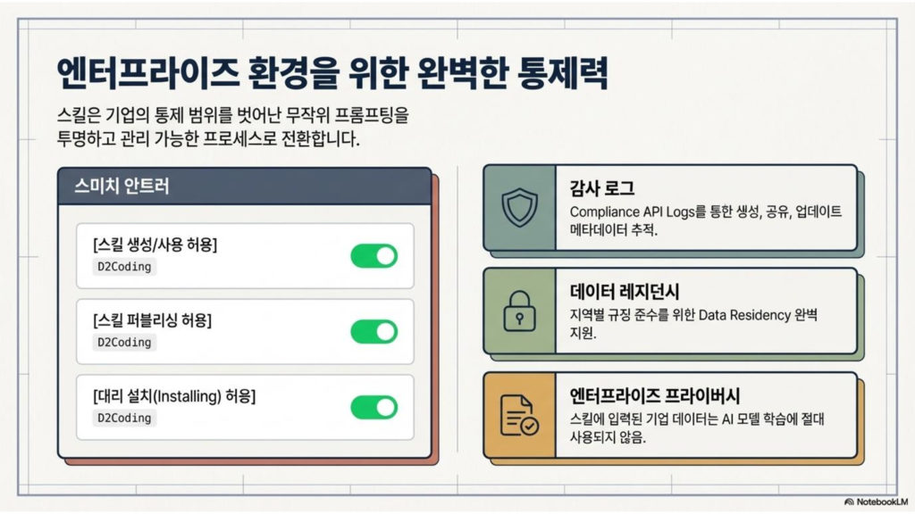 스킬은 권한, 로그, 데이터 위치까지 관리돼요