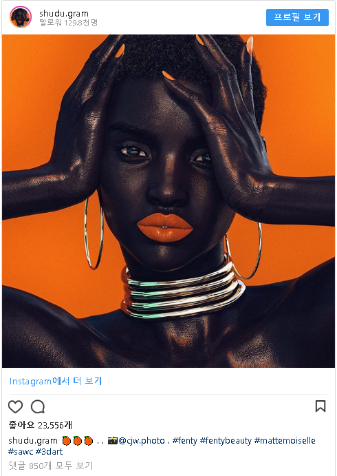 그동안, 펜티 뷰티(Fenty Beauty)는 컴퓨터 생성 인스타그램 모델인 슈두(Shudu)가 특정 펜티 립스틱 제품을 “바른” 인스타그램 사진을 리포스팅 하였습니다.
