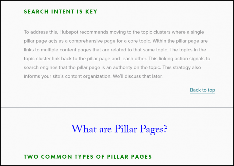 필라 페이지는 주제 클러스터를 구성하는 하위 주제를 통해 하나의 주제를 심층적으로 다룹니다. 즉, 필라 페이지는 긴 형태의 콘텐츠의 최종 양식일 것이라는 뜻입니다. 필라 페이지는 사이트에서 쉽게 찾을 수 있어야 하며, 방문자가 여러분의 사이트에서 하위 주제를 쉽게 찾을 수 있어야 합니다. 또한 긴 페이지에서 사람들이 길을 잃지 않도록 제어장치를 설치해야 합니다.