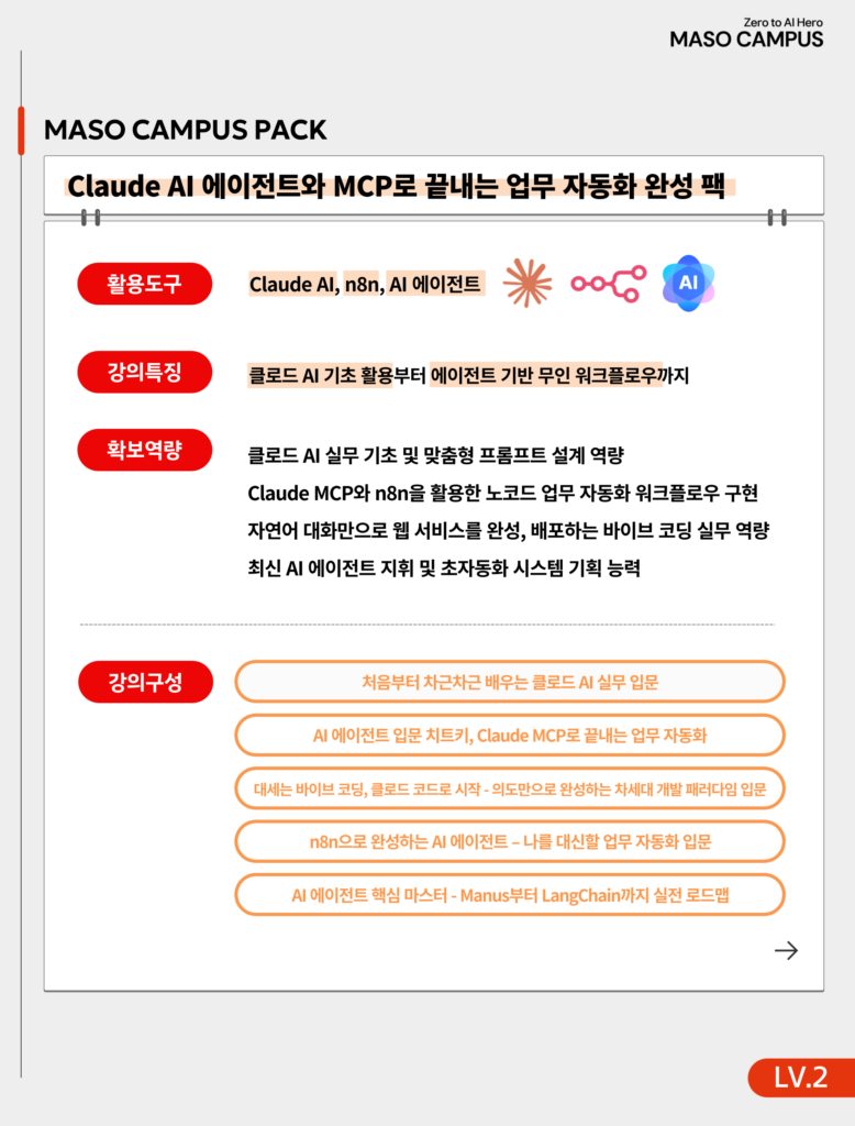 이 패키지는 처음부터 개발 지식이 없어도 시작할 수 있도록 구성되어 있습니다. Claude 활용과 n8n을 통해 코딩 없이 자동화를 경험하고, 이후 필요에 따라 MCP와 LangChain으로 확장할 수 있는 구조입니다. 즉, 처음부터 어려운 기술을 요구하지 않으면서도, 성장에 따라 더 깊이 들어갈 수 있는 유연한 학습 경로를 제공합니다. 누구나 시작할 수 있지만, 어디까지든 확장할 수 있다는 점이 핵심 차별점입니다.
