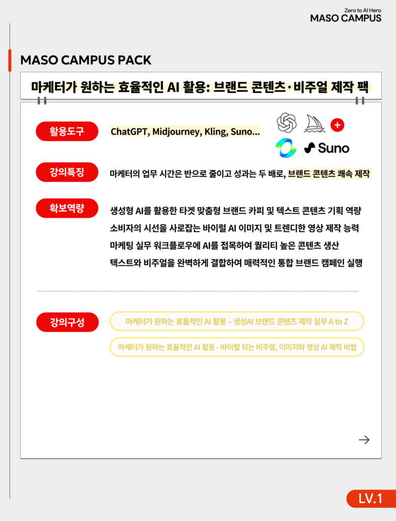 도구의 기능을 파편적으로 익히는 단계를 넘어 마케터의 감각이 AI의 생산성과 결합하여 비즈니스 성과를 창출하는 새로운 워크플로우를 경험해 보시기 바랍니다.