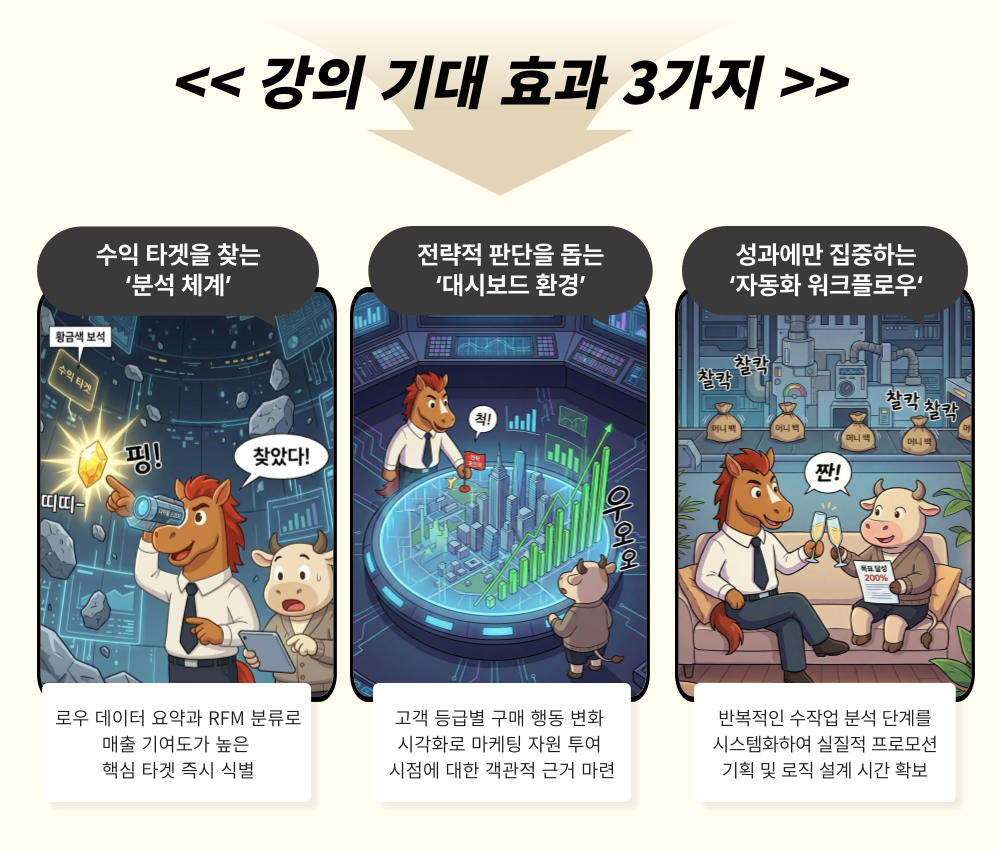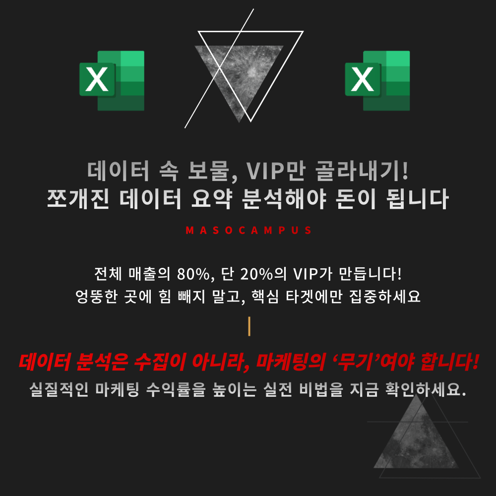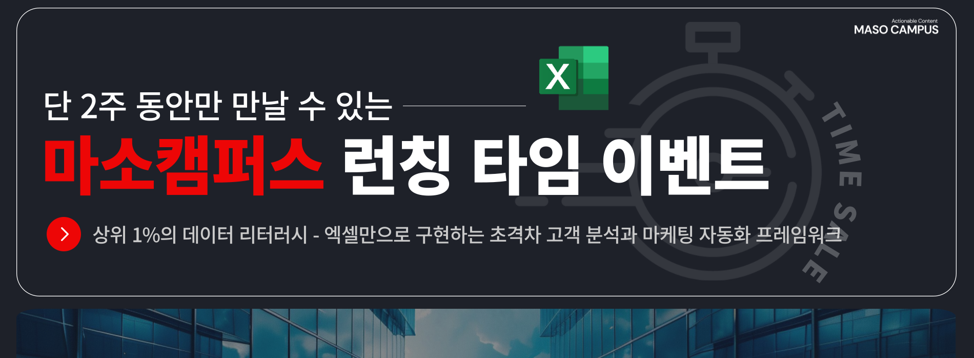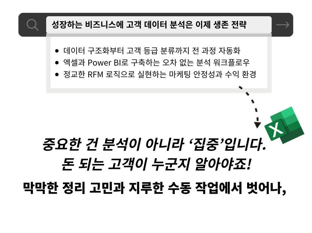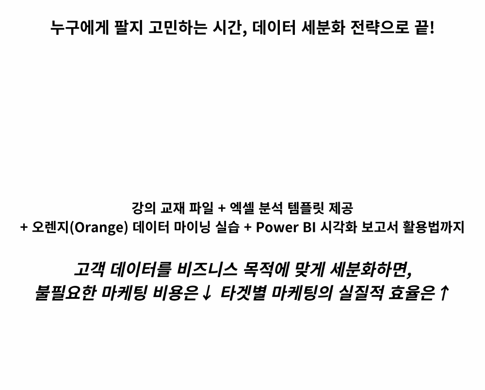 A. 특별한 분석 툴(Python 등)을 설치할 필요는 없습니다. 대중적인 엑셀만으로도 충분히 고객 데이터를 요약하고 RFM 분석을 수행할 수 있도록 구성되어 있습니다. 다만, 실습 과정에서 구글 스프레드 시트나 엑셀을 활용하므로 기본적인 문서 도구 사용이 가능하시다면 더욱 원활한 학습이 가능합니다.