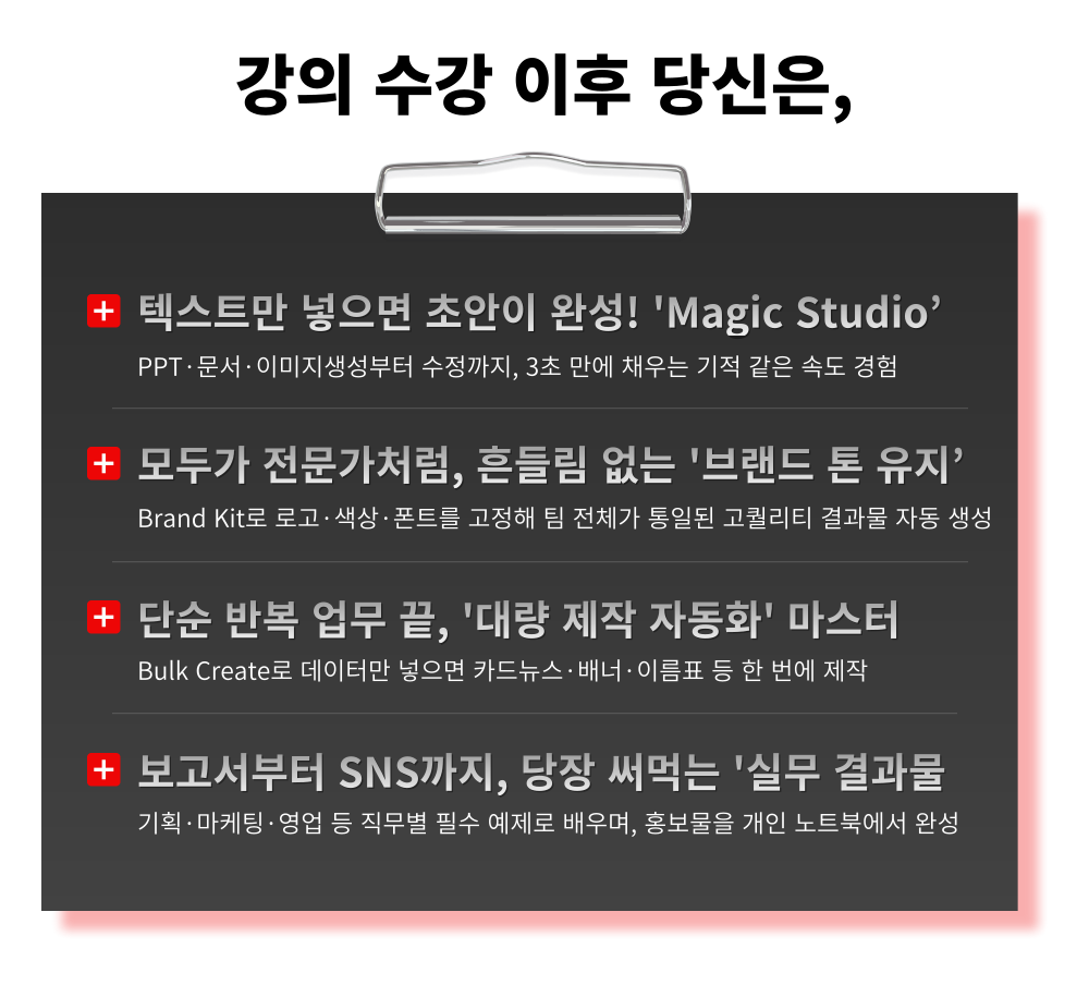 디자인 툴이 익숙하지 않아서 항상 결과물이 마음에 안 들었는데, 이 강의를 통해 Canva AI를 제대로 쓰는 방법을 알게 되었어요!