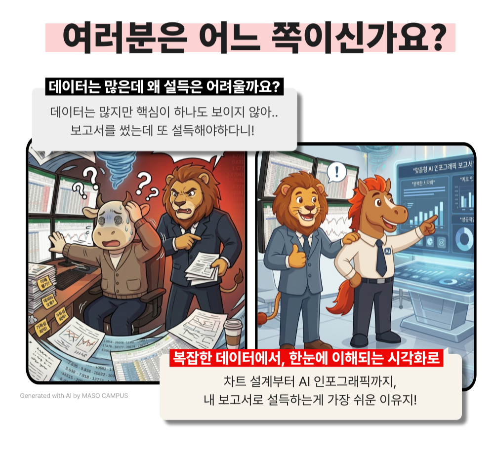 단순 수작업은 AI에 맡기고, 당신의 통찰을 ‘반박 불가한 시각 전략’으로 증명하세요.