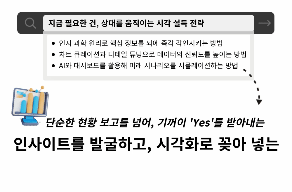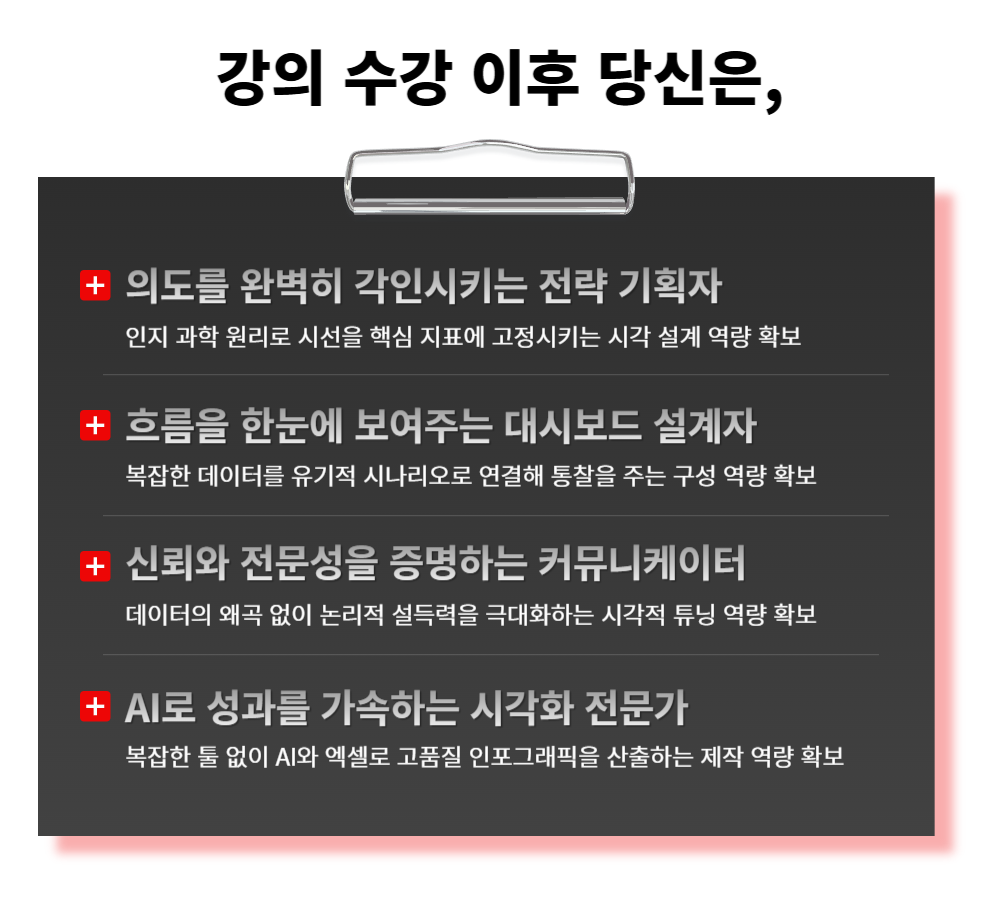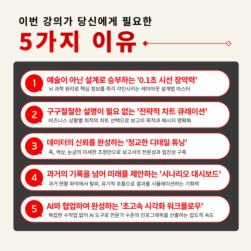 인지 과학 원리와 AI를 활용해 엑셀 속 숫자를 설득력 있는 시각적 전략으로 바꾸는 실무 강의입니다.