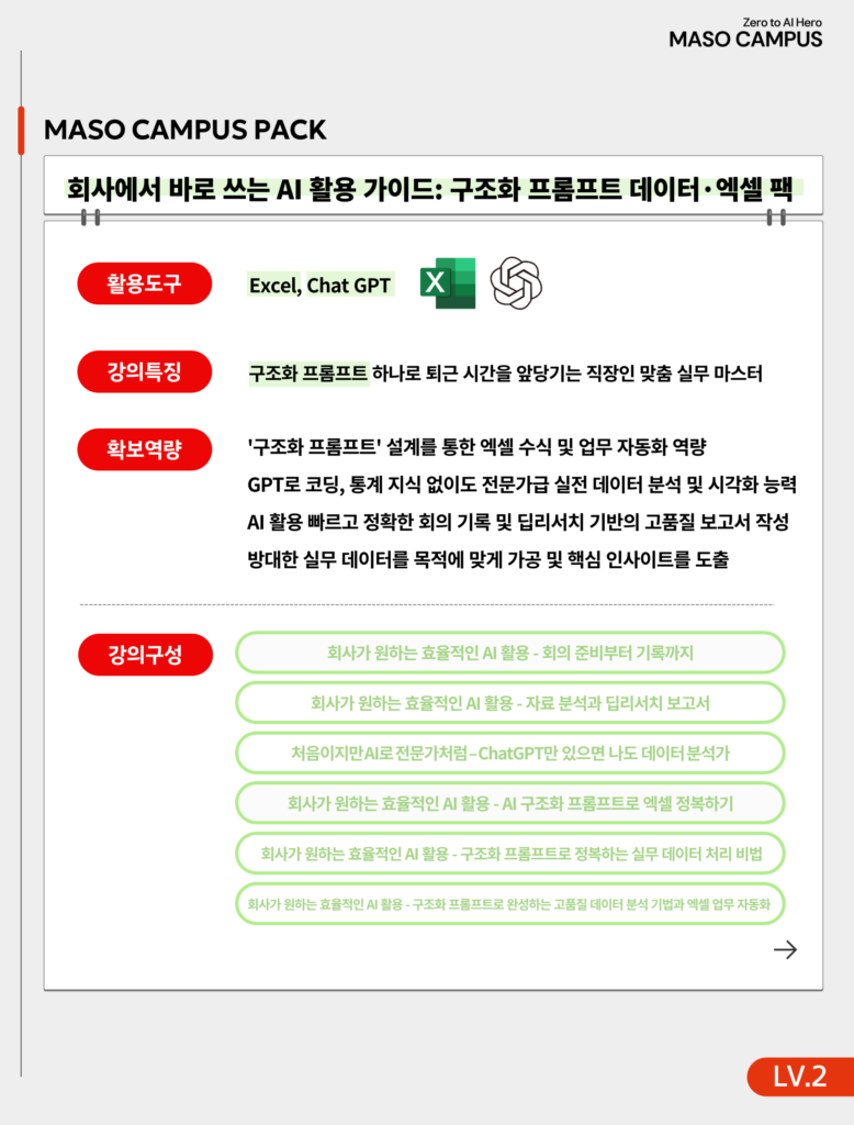 본 패키지는 AI를 활용해 회의 기록과 리서치라는 기초 업무부터 정교한 엑셀 데이터 분석 및 업무 자동화까지 전 과정을 하나의 고효율 데이터 워크플로우로 연결하는 실무 역량 강화를 목표로 합니다.
