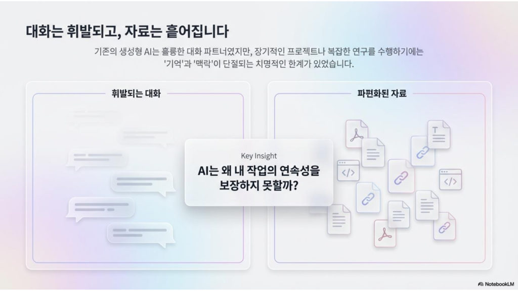 대화가 끝나면 맥락이 사라지고, 자료는 여기저기 흩어져 있는 문제요.