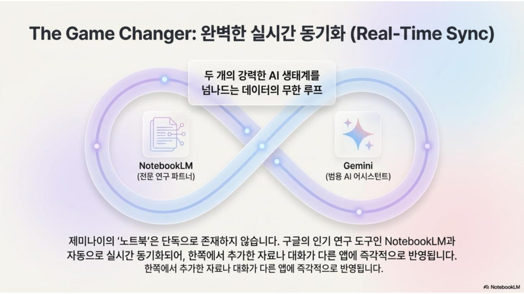 제미나이와 NotebookLM이 실시간으로 양방향 동기화돼요.