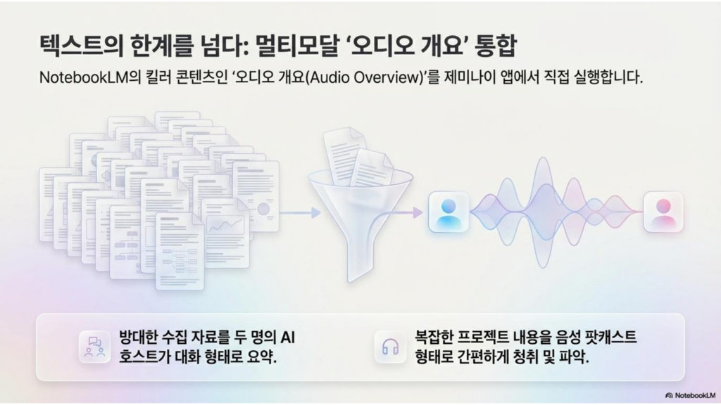NotebookLM의 ‘오디오 개요(Audio Overview)’ 기능이 제미나이 앱에서도 실행돼요.