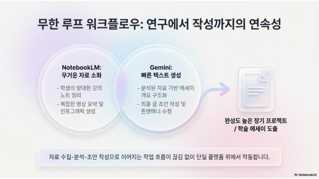 NotebookLM이 방대한 자료를 소화하면, 제미나이가 그걸 바탕으로 글을 써요.