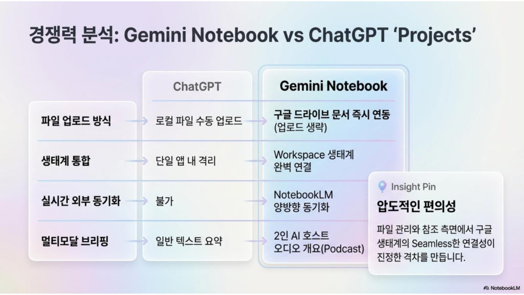 반면 Gemini Notebook은 구글 생태계 전체와 끊김 없이 연결돼요.