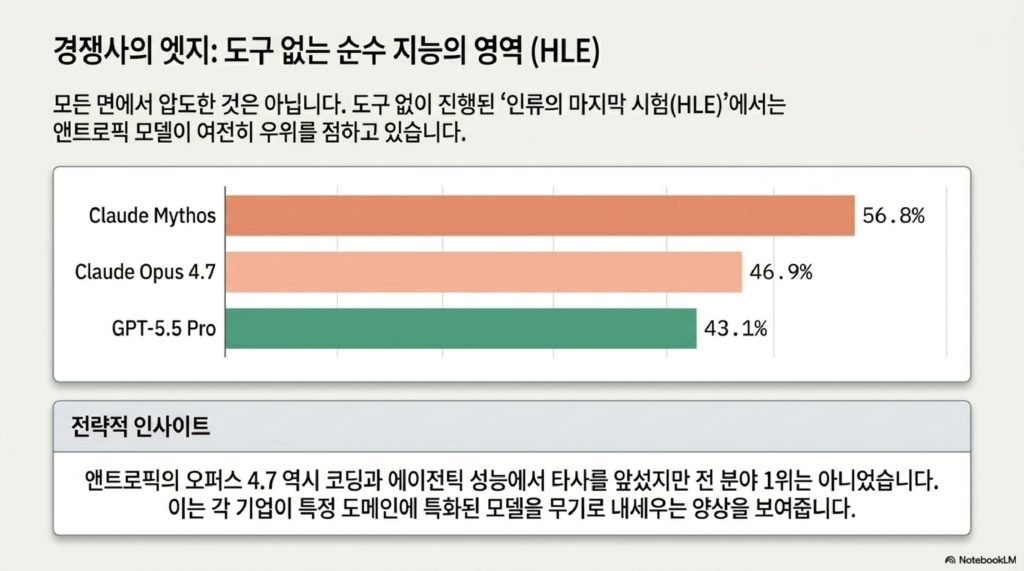 Claude Mythos 56.8%, Claude Opus 4.7 46.9% — GPT-5.5 Pro는 43.1%에 그쳤어요 📌