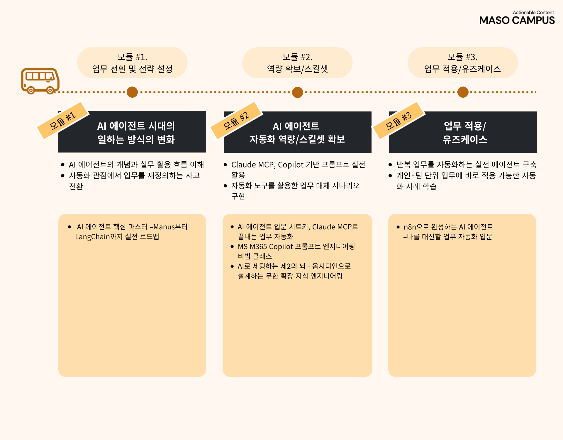 AI 에이전트 개념과 업무 전환 전략부터, 자동화 도구를 활용한 실행 역량, 그리고 직무별 실전 활용 사례까지 단계적으로 학습하며 AI를 업무를 대신 수행하는 동료이자 시스템으로 활용하는 방법을 익힙니다.