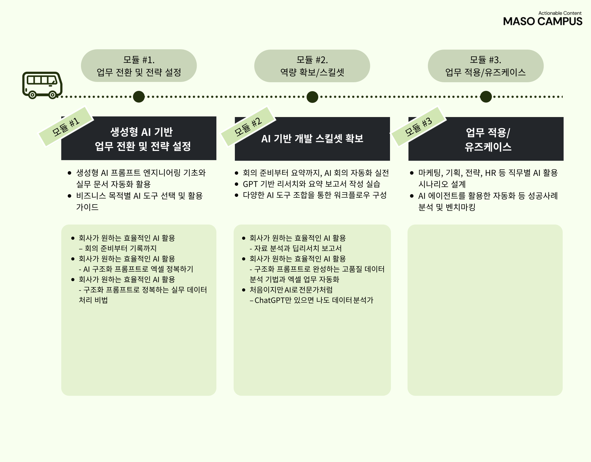 이 트랙은 AI 시대에 맞는 업무 전환, 자동화 도구 활용, 직무별 실전 적용까지 전방위적으로 학습하며 실질적인 비즈니스 경쟁력을 키우게 될 것입니다.